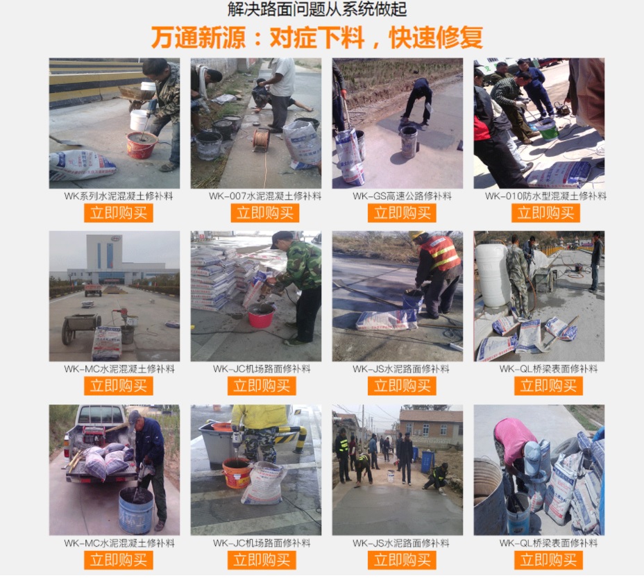 水泥混凝土修補(bǔ)專家----萬通新源中國(guó)專業(yè)水泥混凝土修補(bǔ)料材料供應(yīng)商!水泥混凝土修補(bǔ)料專門針對(duì)水泥混凝土路面的麻面、空鼓、起皮、脫殼、裂縫、漏筋等病害進(jìn)行及時(shí)修補(bǔ),直接涂抹在病害部位即可,有好的抗壓和粘接強(qiáng)度,可實(shí)現(xiàn)薄層修補(bǔ),在高速和高壓的行車狀態(tài)下不會(huì)出現(xiàn)破碎和脫落現(xiàn)象;凡是水泥混凝土表面病害均適用于本材料。